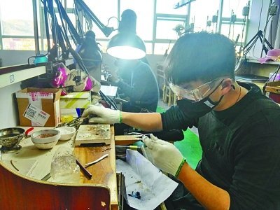 在珠寶加工工作室里,一排排機(jī)器后面,大學(xué)生們正低著頭專心致志加工玉石,有的在雕刻,有的在打磨,其中還有8位來自緬甸的留學(xué)生。緬甸留學(xué)生相猛江用不太熟練的漢語對(duì)記者說:"我來了7個(gè)月,正在學(xué)習(xí)雕刻玉馬。"